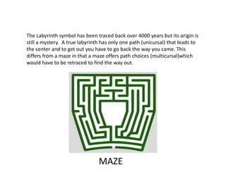 The document discusses the history and characteristics of labyrinths versus mazes. A true labyrinth has a single path that leads to the center and back out, while a maze offers choices of paths. The author describes visiting three different styles of labyrinths - a classical painted concrete labyrinth at a church, a medieval replica at a hospice, and a contemporary hedge labyrinth at an art museum. All were in serene natural settings. The author concludes by reflecting on how a labyrinth's single path to the center and back relates to their life journey of achieving goals along a clear path without changing course.