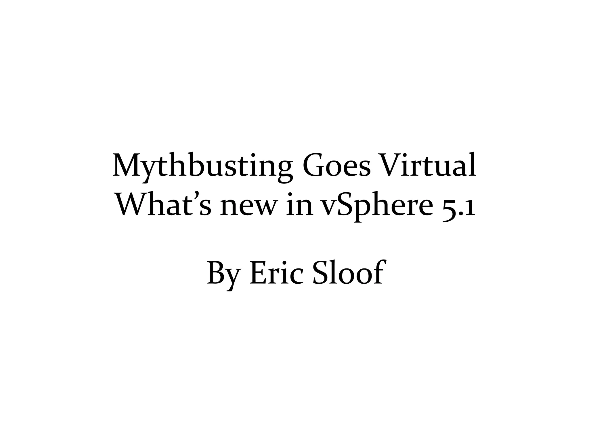 The document summarizes new features in vSphere 5.1 that address common myths about virtualization limitations. It discusses that vMotion can now occur without shared storage using enhanced vMotion, vSphere management no longer requires Windows with the new web client, vSphere Replication provides site disaster recovery without SRM, the VMFS host limit for linked clones increased from 8 to 32, and distributed switch configurations can now be backed up and restored.
