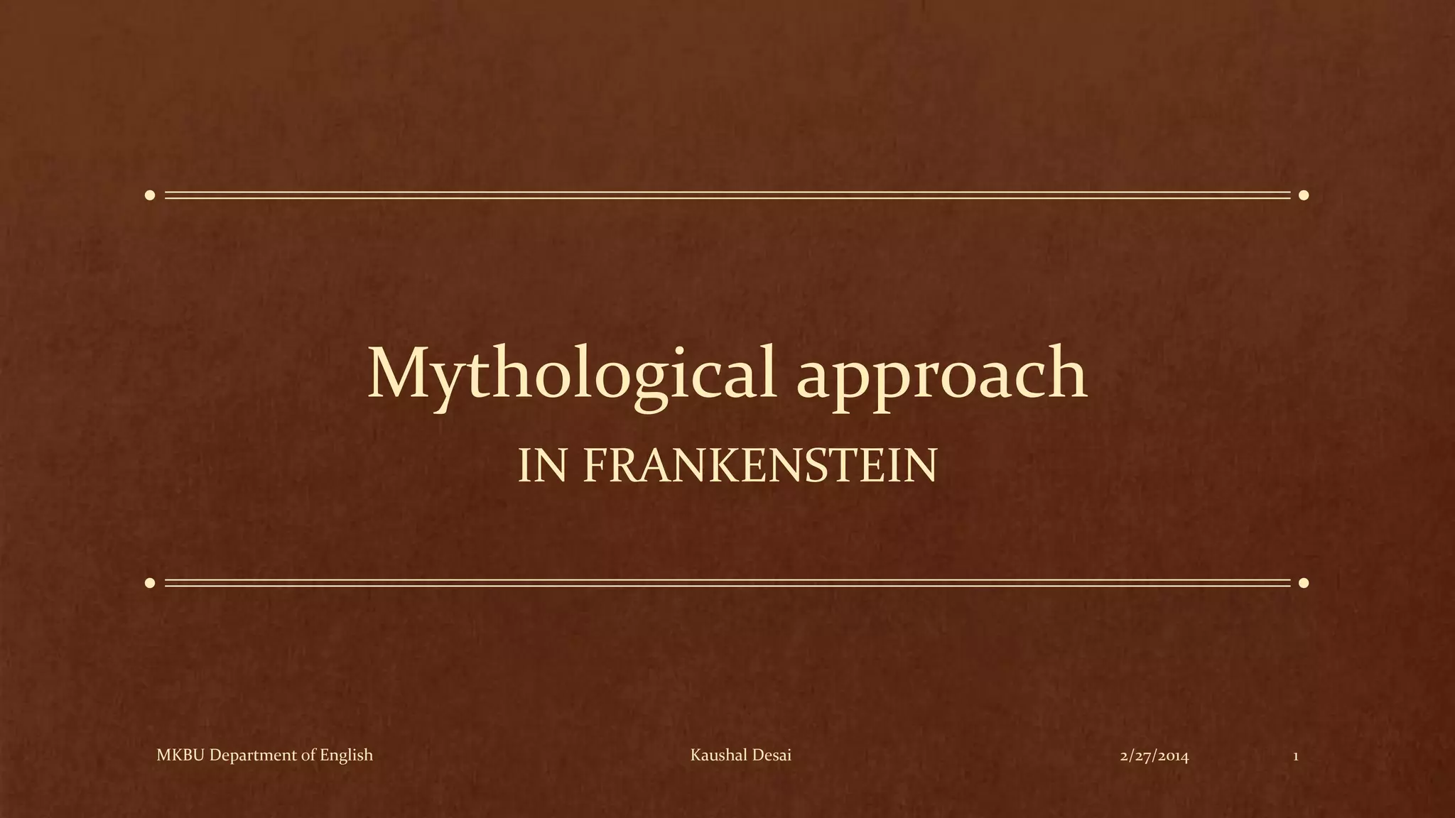 The document discusses the use of mythology in Mary Shelley's Frankenstein. It provides background on myths such as Prometheus, Narcissus, and Paradise Lost that influenced Shelley's novel. Specifically, Shelley incorporated the Promethean myth of creating humans and breaking natural rules, similar to Victor Frankenstein's innovative work. The novel also references the "modern Prometheus" in its subtitle. Mythology can be interpreted as a writer fitting the past into the present in a new way or as a repetition of history. Shelley presented mythology in a proper way in Frankenstein, writing science fiction that takes the novel to a higher level.