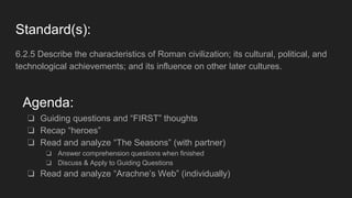 This document provides an introduction to Greek mythology. It begins with guiding questions about the meanings myths had for ancient Greeks and what they mean for us today. It then recaps heroes in Greek mythology, noting they were admired for traits like resourcefulness, not necessarily for being good role models by modern standards. Students read and analyze the myth of Proserpina/Persephone and answer comprehension questions. They are prompted to think about other reasons beyond heroic deeds that Greeks may have created myths, such as to explain natural phenomena like seasons.