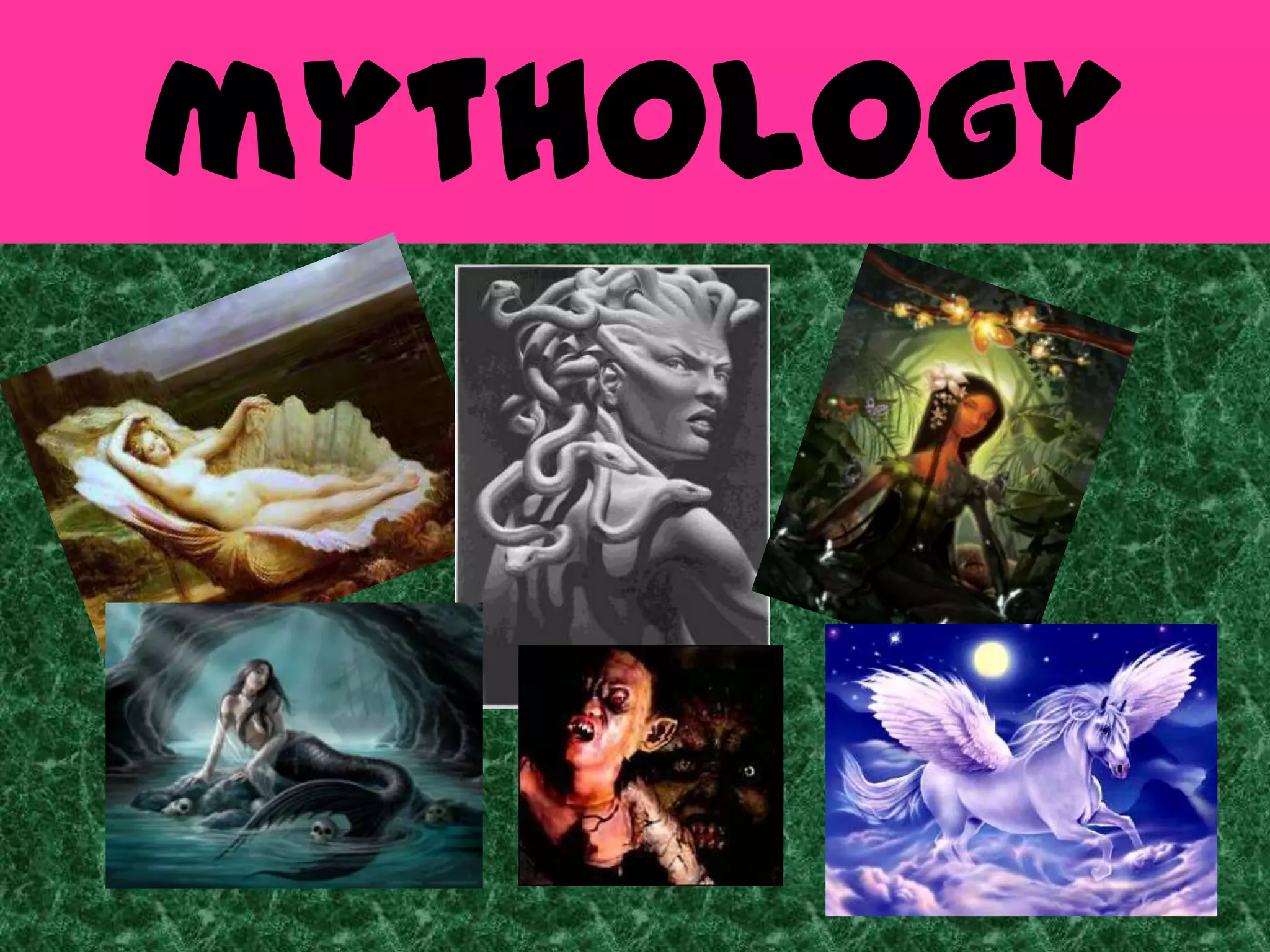 This document provides an overview of mythology, including definitions of mythology and myth. It discusses the purposes and nature of myths, comparing myths to legends and folktales. The document outlines several theories about the origins of mythology, such as euphemerism, allegories, and the myth-ritual theory. It then examines the functions of mythology according to scholars like Eliade, Honko, and Campbell. The document provides a historical overview of mythology, outlining pre-modern, 19th century, and 20th century theories. It also briefly discusses comparative mythology and the systematic comparison of myths across cultures.