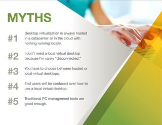 Local virtual desktops allow users to access their desktop environment and applications even without a network connection by running the virtual desktop environment locally on their device. This provides flexibility for mobile workers to work from anywhere. It also improves security, reliability and manageability compared to physical desktops by normalizing desktop images and making updates and patching fail-safe. Citrix XenDesktop with FlexCast technology uniquely supports both hosted and local virtual desktop models to enable working from anywhere on any device.