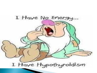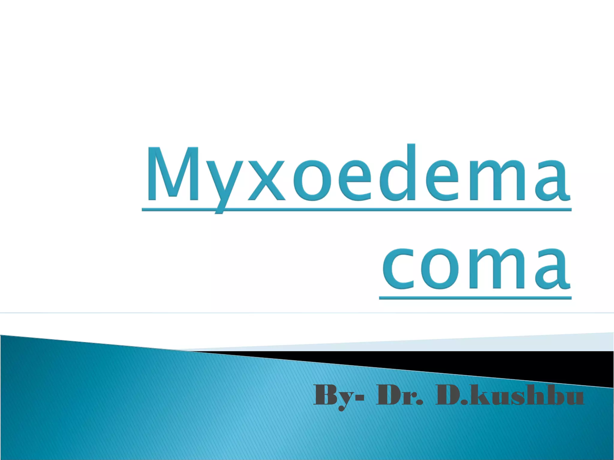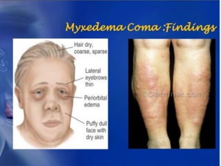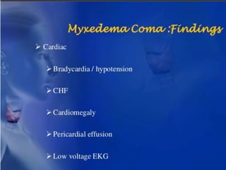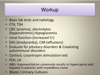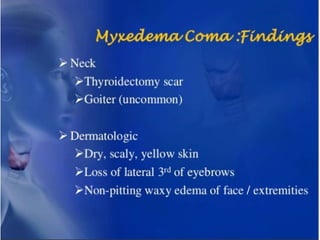 This document discusses myxedema coma, a life-threatening complication of severe hypothyroidism. It can be precipitated by a stressful event in someone who is already hypothyroid. Primary symptoms include altered mental status, low body temperature, low blood pressure, slow heart rate, and hypoventilation. Treatment involves supportive care in the intensive care unit, treating hypothermia, hyponatremia, and providing thyroid hormone replacement through intravenous levothyroxine and possibly liothyronine, as well as hydrocortisone therapy.