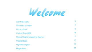 MZG là một agency marketing kỹ thuật số tại Việt Nam, hướng tới nâng cao chất lượng cuộc sống và hiệu quả công việc thông qua các dịch vụ sáng tạo và phát triển cộng đồng. Công ty sở hữu nhiều thương hiệu như Mediaz, Highway Digital và Magic Bow, cung cấp dịch vụ từ tư vấn đến triển khai digital marketing, đồng thời phát hành sách chuyên ngành để phổ cập kiến thức. MZG cam kết xây dựng uy tín và niềm tin, đồng thời phát triển tiềm năng của con người trong tổ chức.