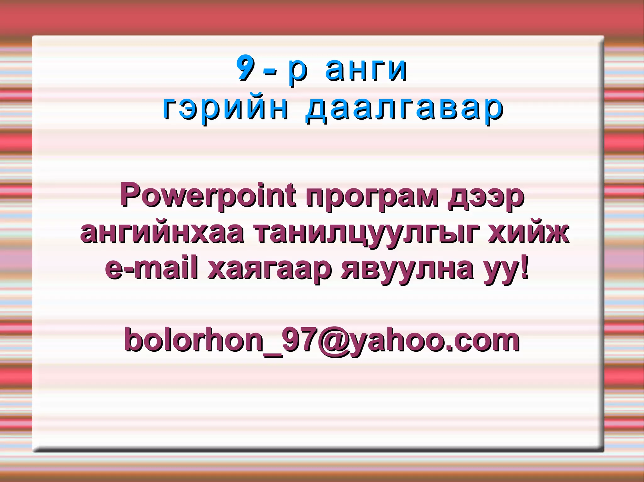 9-р анги гэрийндаалгавар Powerpoint програм дээр ангийнхаа танилцуулгыг хийж e-mail хаягаар явуулна уу! [email_address]