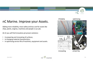 The document provides examples of results from using various products and services from nC Group of Companies to improve reliability, safety, and reduce costs for assets like ships, plants, engines, and equipment. Some key results highlighted include reducing fuel costs for heating pipelines using thermal insulating coatings with a return on investment of 95 days, protecting ship hulls from fouling for over a year using nano-based anti-fouling coatings at a lower cost than traditional coatings, and avoiding an expected $23,000 repair project by adding a nano-based thermal fluid system conditioner for $5,900. The document aims to convince readers that nC Group can be a sensible partner through demonstrated cost savings and performance improvements.