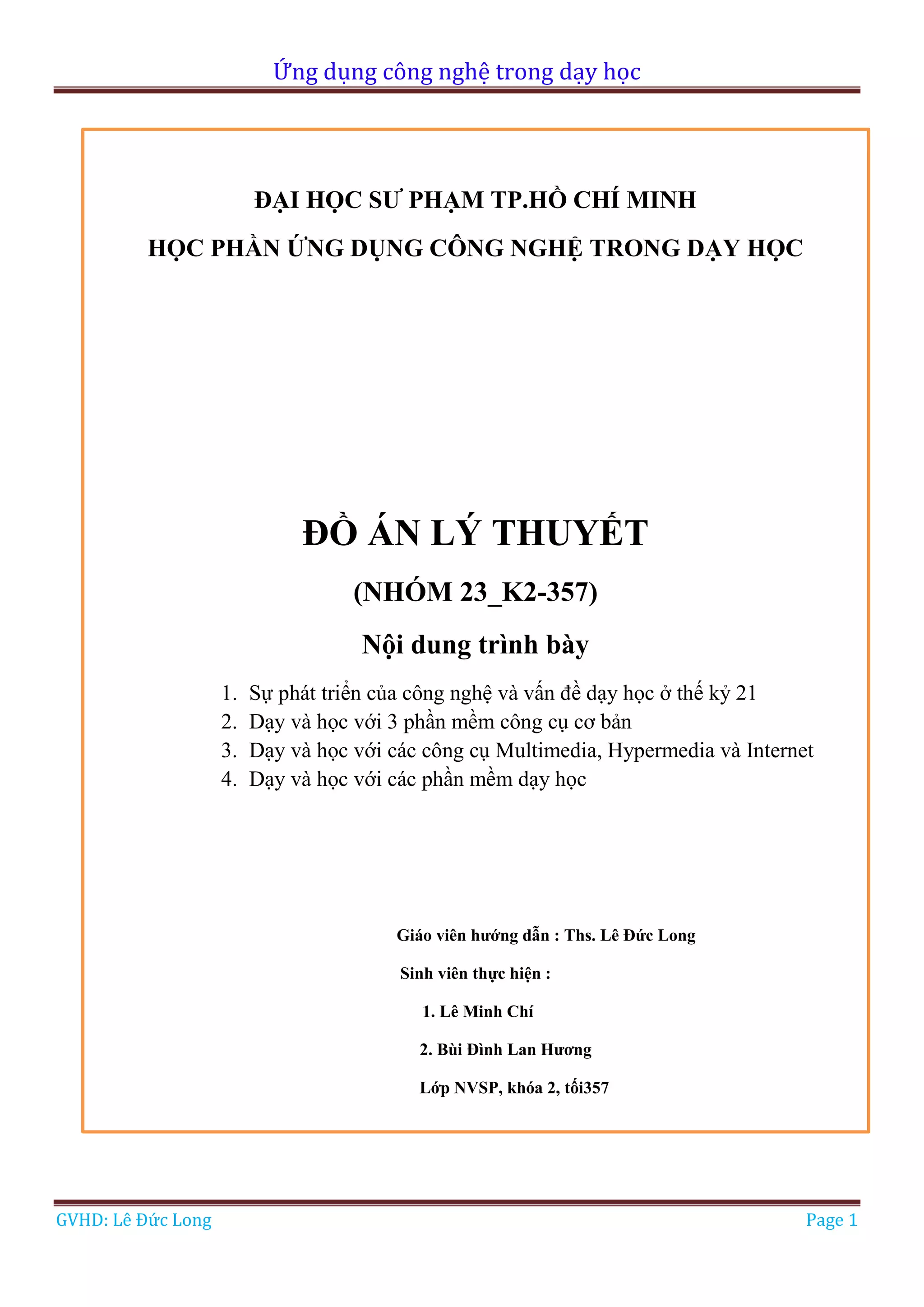 Tài liệu trình bày về ứng dụng công nghệ trong dạy học với các nội dung như sự phát triển của công nghệ, các phần mềm dạy học cơ bản, multimedia, hypermedia và internet. Nó cũng đề cập đến tiêu chuẩn công nghệ đối với giáo viên và học sinh trong thế kỷ 21, cùng với các ứng dụng ICT hỗ trợ học tập. Tài liệu nhằm thúc đẩy việc tích hợp công nghệ vào giáo dục để nâng cao hiệu quả dạy học.