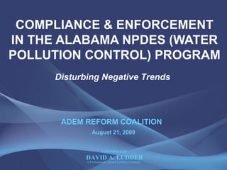 This document summarizes compliance and enforcement trends in Alabama's NPDES (water pollution control) program from 2004-2009. It finds that the percentage of major and non-major NPDES facilities inspected and receiving enforcement actions has declined in recent years. Data reliability for non-major facilities is also a concern. The document recommends reforms to strengthen enforcement of Alabama's water pollution regulations.