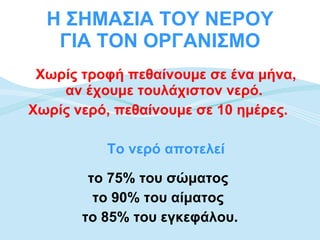 Η ΣΗΜΑΣΙΑ ΤΟΥΝΕΡΟΥ ΓΙΑ ΤΟΝ ΟΡΓΑΝΙΣΜΟ Χωρίς τροφή πεθαίνουμε σε ένα μήνα, αν έχουμε τουλάχιστον νερό. Χωρίς νερό, πεθαίνουμε σε 10 ημέρες. Το νερό αποτελεί το 75% του σώματος το 90% του αίματος το 85% του εγκεφάλου.