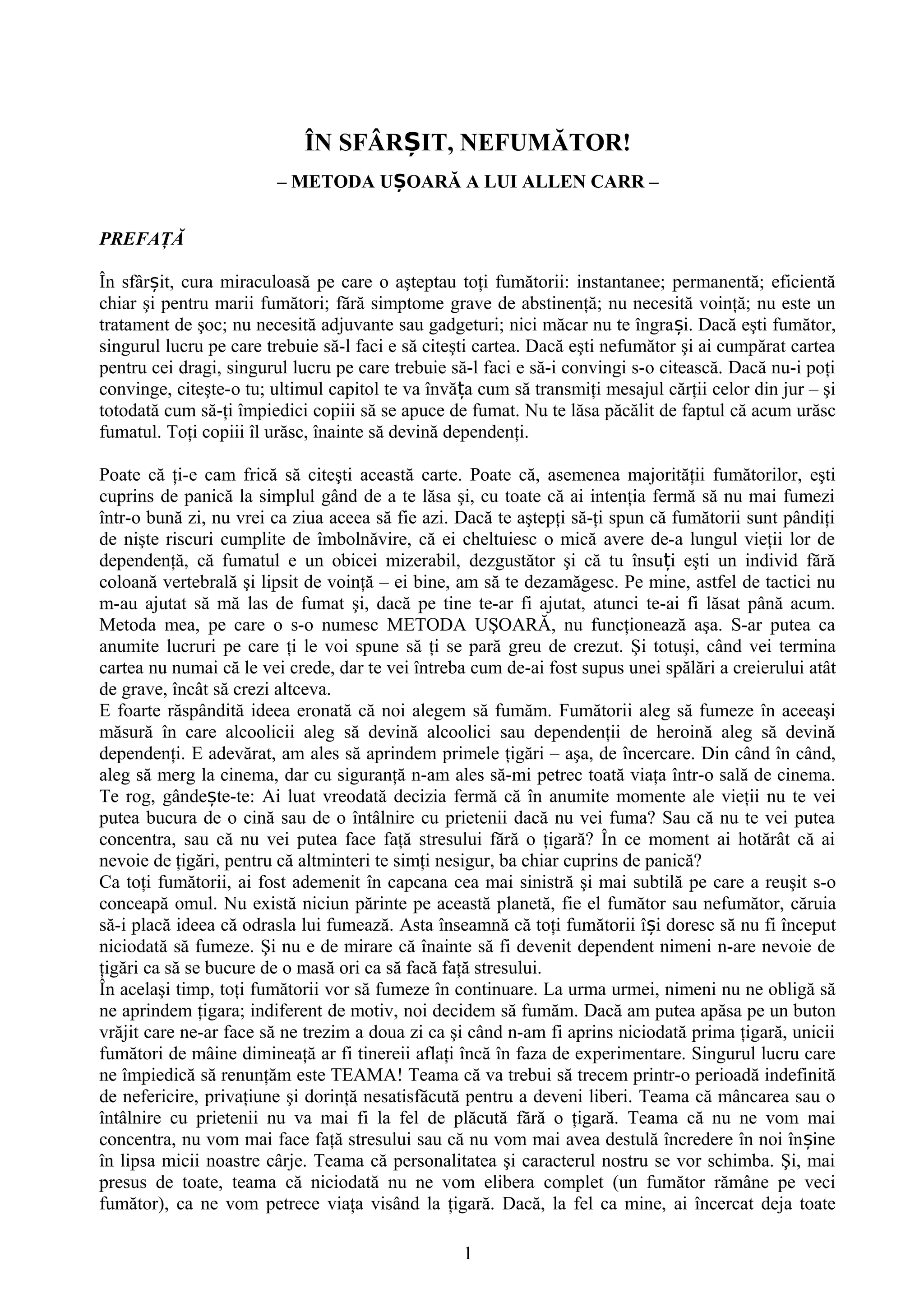 Cartea "Înfine, nefumător!" de Allen Carr prezintă o metodă ușoară și eficientă pentru renunțarea la fumat, promițând un proces fără voință sau simptome severe de abstinență. Autorul, un fost fumător, subliniază că majoritatea fumătorilor doresc să renunțe, dar sunt blocați de frica de a nu mai putea placa în viața socială fără țigări. Prin citirea cărții, cititorii pot descoperi cum să-și depășească temerile și să renunțe la fumat în mod eficient, simțindu-se eliberați de această dependență.
