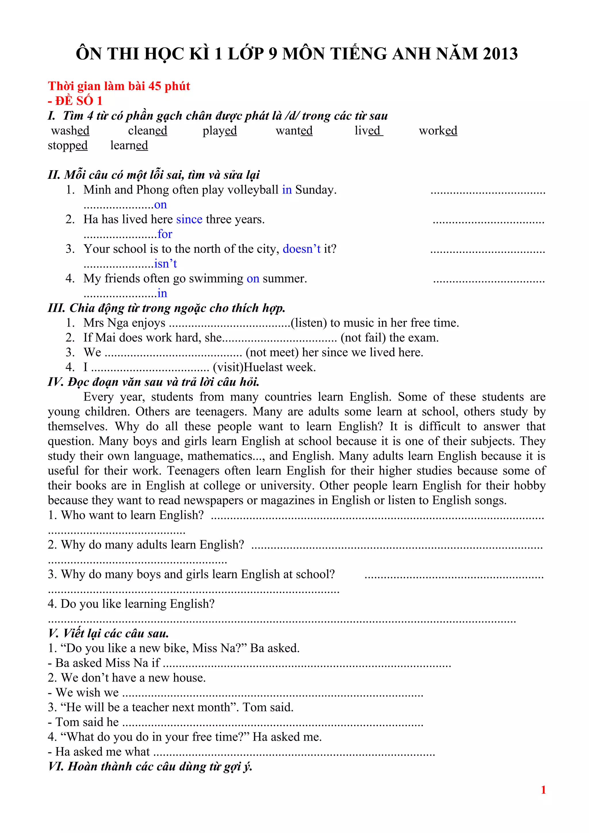 Students took an English midterm exam for 9th grade in 2013. The exam consisted of 6 sections testing various English skills. Section 1 tested pronunciation of words. Section 2 had students identify and correct errors in sentences. Section 3 tested verb conjugation. Section 4 involved reading a passage and answering comprehension questions. Section 5 tested rewriting sentences. Section 6 completed sentences using suggested words. The document provided the exam questions and a sample answer key.
