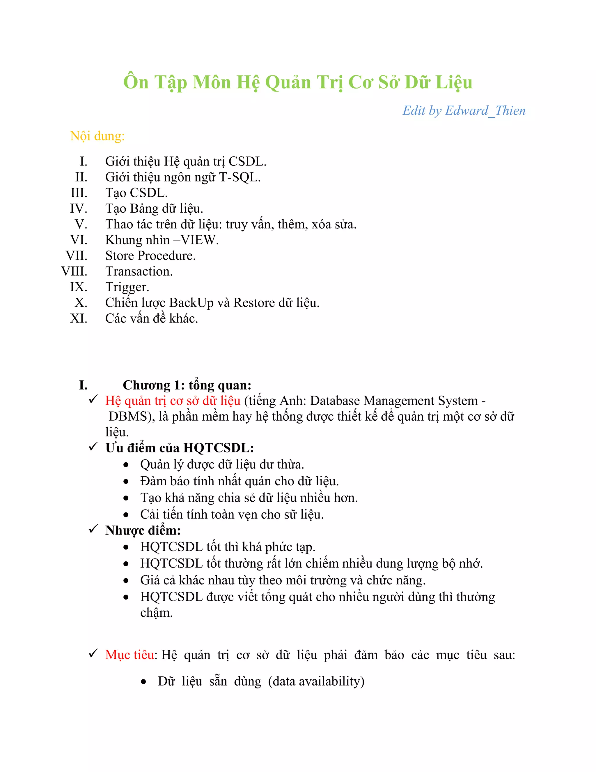 Tài liệu cung cấp một cái nhìn tổng quan về hệ quản trị cơ sở dữ liệu, bao gồm các thành phần và đặc điểm của nó, cùng với ngôn ngữ T-SQL. Nó mô tả quy trình tạo và quản lý cơ sở dữ liệu, thao tác trên dữ liệu, cũng như các khái niệm liên quan như view, store procedure, transaction và trigger. Cuối cùng, tài liệu cũng nhấn mạnh tầm quan trọng của việc backup và restore dữ liệu trong quản lý cơ sở dữ liệu.