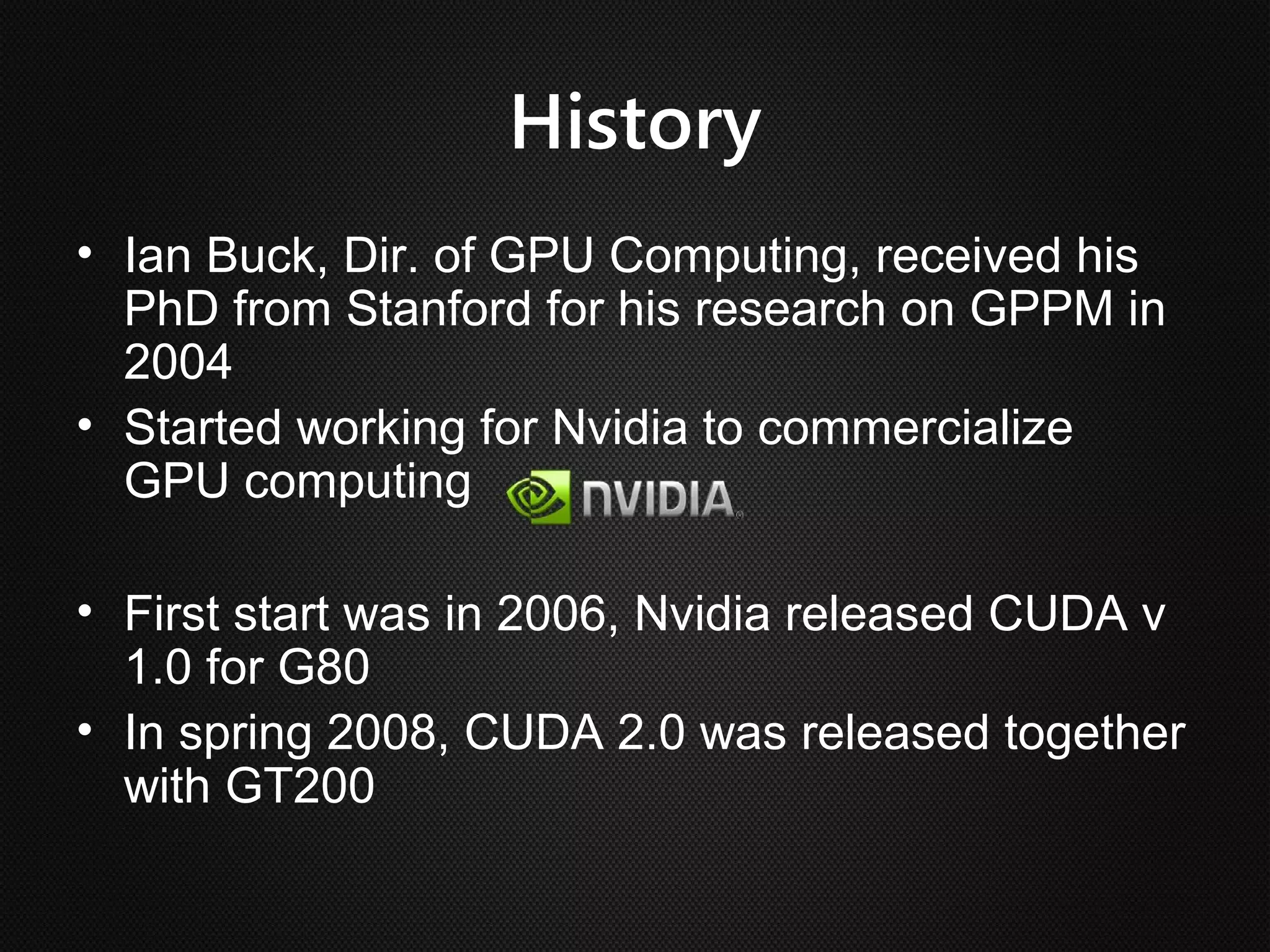 Ian Buck developed GPU computing at Nvidia. CUDA 1.0 was released in 2006, allowing normal applications to utilize GPU processing for higher performance without low-level programming. A GPU can execute many more instructions per clock than a CPU due to its large number of arithmetic logic units. In CUDA, programs specify blocks and threads to distribute work across a GPU. Calling a GPU function launches the specified number of blocks with threads. This massive parallelism allows GPUs to greatly accelerate brute force searches.