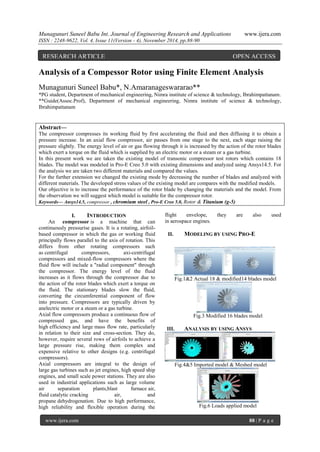 This document analyzes the stresses on an axial compressor rotor using finite element analysis. It summarizes the modeling, analysis, and results of analyzing an existing 18-blade rotor model using two materials (chromium steel and titanium alloy), as well as modified 16-blade and 14-blade models using the same materials. Von Mises stresses were lowest for the 14-blade titanium alloy model. The conclusion is that titanium alloy provides better performance than chromium steel, and reducing the number of blades from 18 to 14 further reduces stresses.