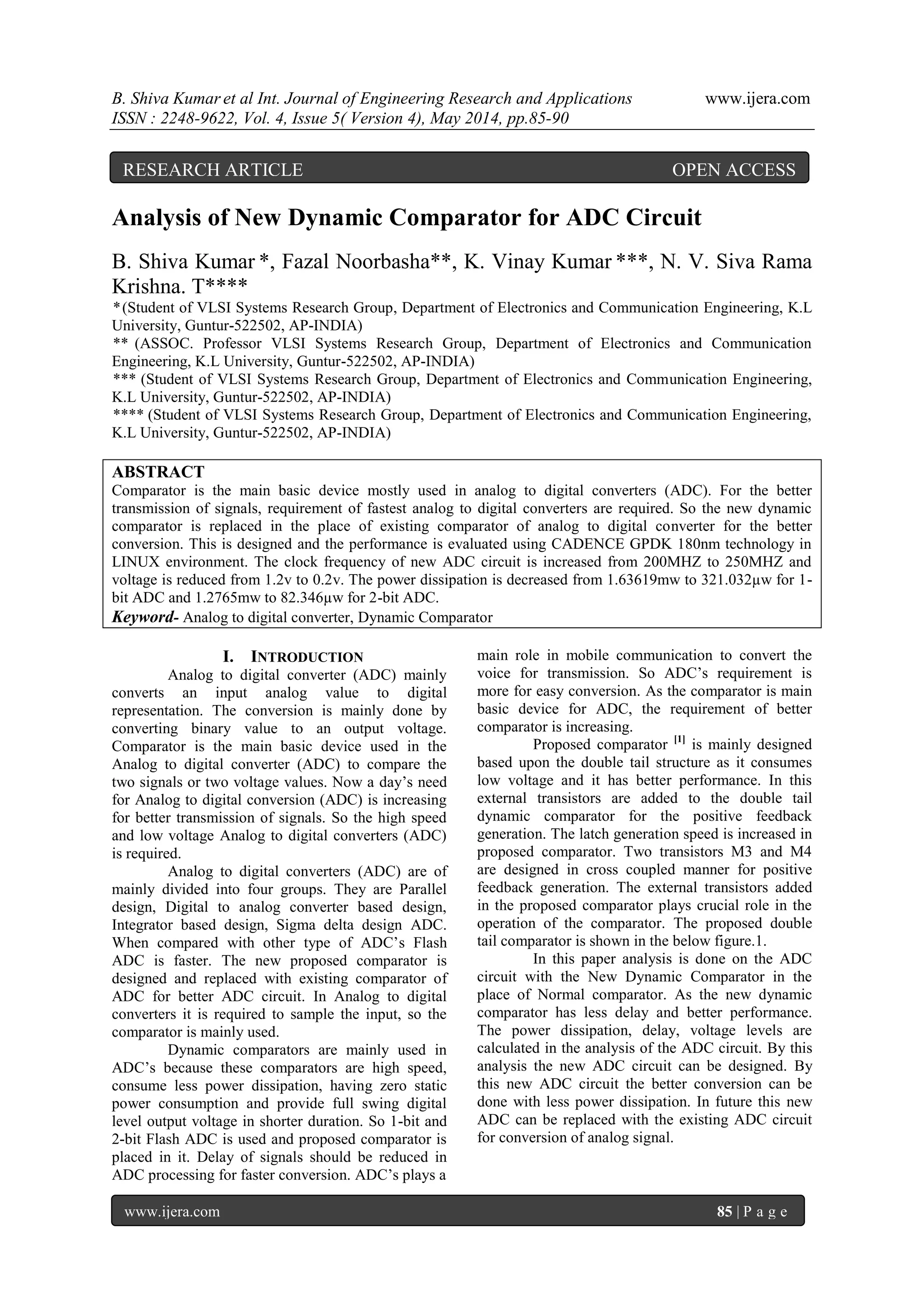 This document presents an analysis of a new dynamic comparator designed for improving the performance of analog to digital converters (ADC). The proposed comparator increases the operational clock frequency from 200MHz to 250MHz while significantly reducing power dissipation. The study evaluates both 1-bit and 2-bit ADC circuits using cadence GPDK 180nm technology, demonstrating improved efficiency in terms of delay and power consumption compared to conventional comparators.