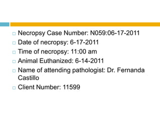 Foo Foo, a 12 month old domestic short hair cat, tested positive for FIV during a spay/neuter program. He presented with numerous skin lesions likely from fighting, a healed corneal ulcer, bilateral otitis externa, and a thickened area on his right lung lobe. During necropsy, five tapeworm segments were also found in his small intestine. FIV likely contributed to respiratory issues and increased susceptibility to other infections.