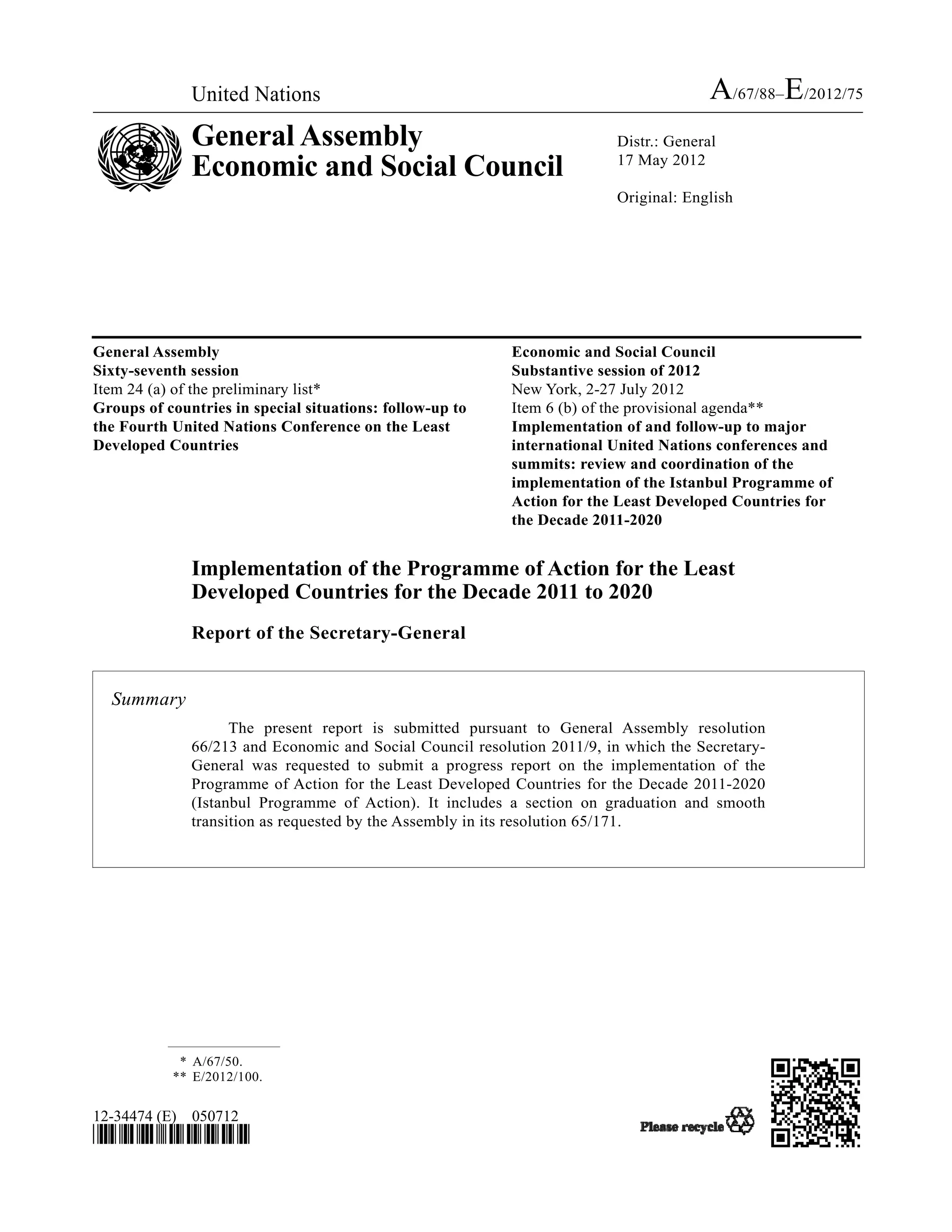 This document provides a summary of the Secretary-General's report on progress implementing the Istanbul Programme of Action for Least Developed Countries. It finds that while GDP growth in LDCs accelerated over the past decade, reaching an average of 6.6% annually between 2001-2010, the growth has been uneven and slowed since the global recession. Poverty reduction progress has also been mixed. The report analyzes trends in key priority areas for LDCs, finding limited structural economic transformation or increases in productive capacity and infrastructure access. It concludes by calling for growth that creates jobs and enables greater poverty reduction and social development progress in LDCs.