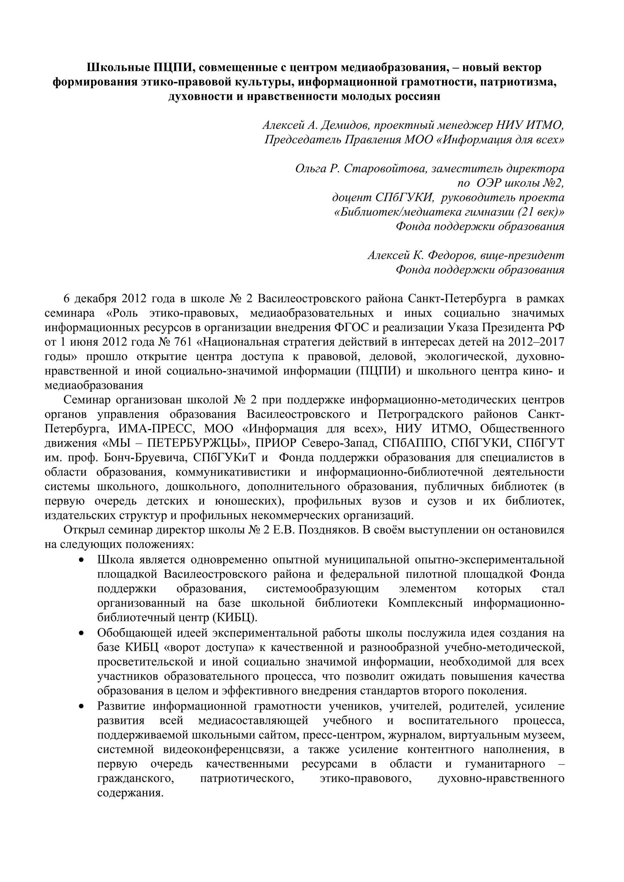 Документ описывает открытие школьного ПЦПИ и центра медиаобразования в Санкт-Петербурге, направленных на формирование этико-правовой культуры и информационной грамотности среди молодежи. Проект поддерживается рядом образовательных и культурных организаций и включает развитие медиасоставляющей учебного процесса, краеведческую работу и спортивное образование. Одной из ключевых задач является создание доступной информационной среды для участников образовательного процесса и внедрение новых образовательных технологий.