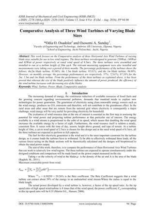 This document compares the performance of three horizontal axis wind turbines with varying blade sizes (2m, 1.5m, and 1m) suitable for low wind regimes. Data was collected over three months on the power output of the three turbines. The results showed that while larger blades produced more power, the efficiency and percentage of rated power produced increased with decreasing blade size. Specifically, the 1m blade turbine performed at 94.89% of its rated capacity on average, compared to 95.81% for the 1.5m turbine and 83.96% for the 2m turbine. Thus, the smaller turbine was more effective at extracting power from the low wind speeds.