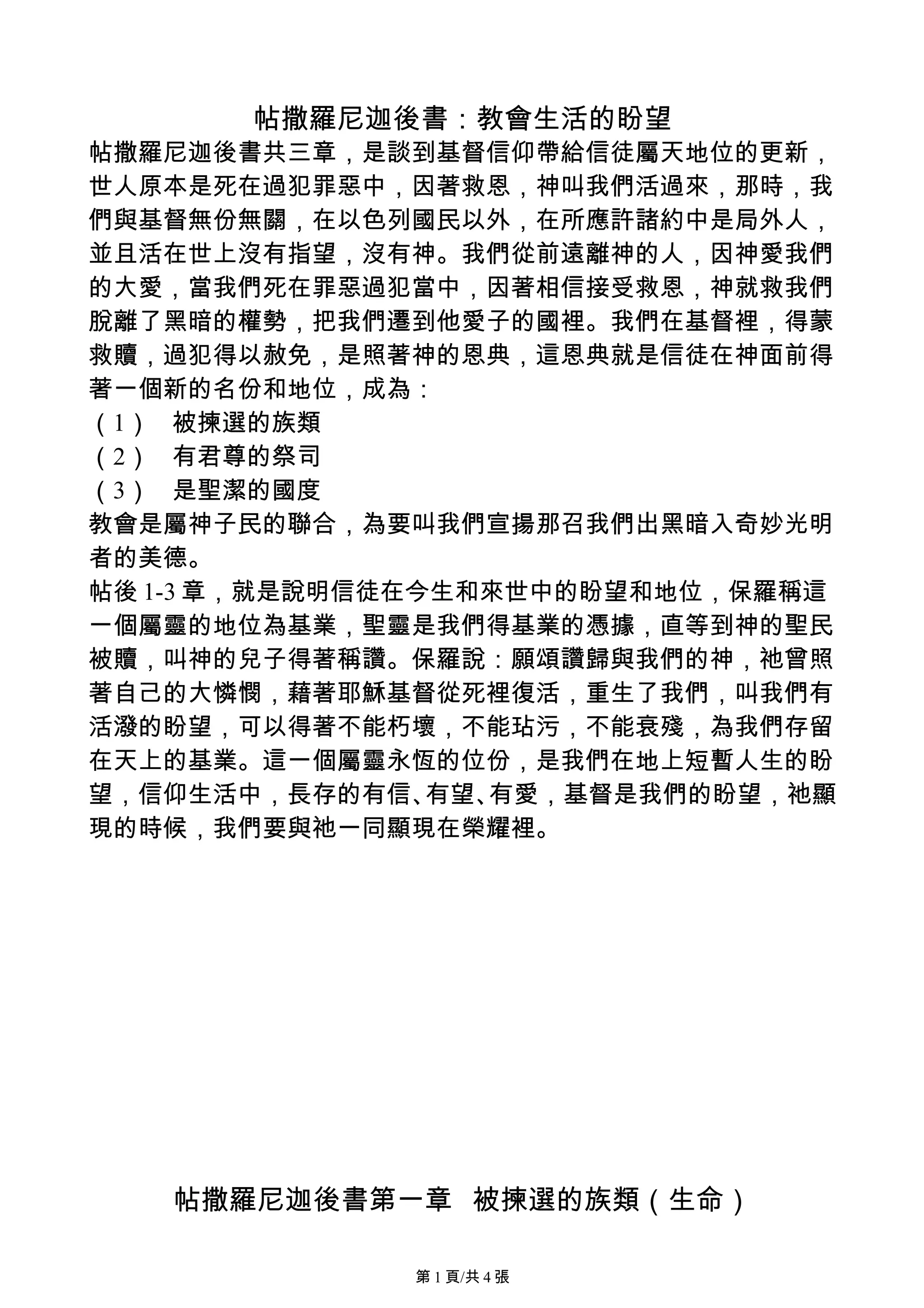 帖撒羅尼迦後書探討基督信仰對信徒的靈性更新和身份轉變,以及在今生和來世中的盼望。信徒因著神的恩典被引入新的生命狀態,成為被揀選的族類和有君尊的祭司,並在艱難中持守信心。保羅提到永恆的基業和基督的再來,是信徒生活的支持與鼓勵,並強調要遵循真理和活出聖潔的生活。