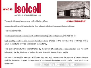 Isolcell Italia Spa is a leader in fire prevention technology, focusing on nitrogen-based systems that reduce oxygen levels to prevent fires. Their innovative N2 firefighter® method creates an auto-extinguishing atmosphere that is safe for human habitation and environmentally friendly. The system offers numerous advantages, including low maintenance costs, customization options, and compatibility with existing fire monitoring systems.