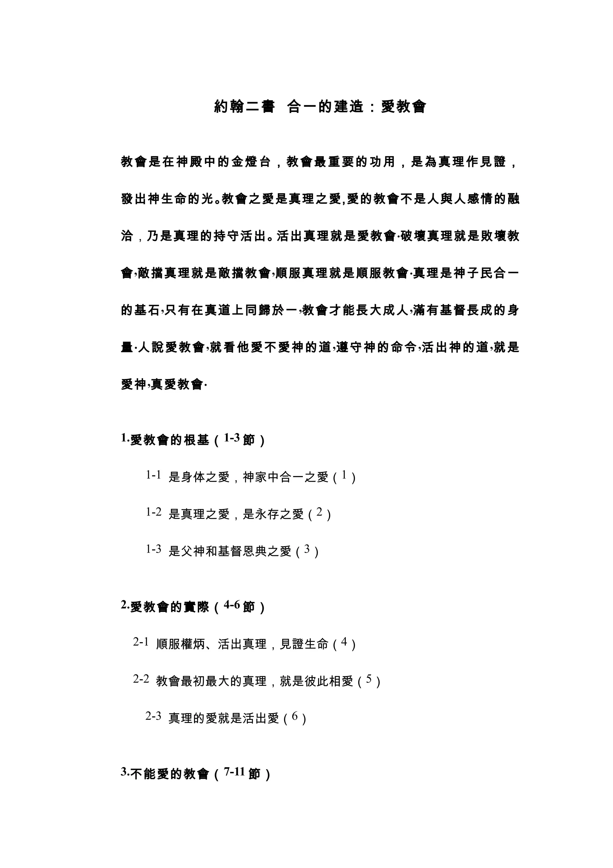 约翰二书强调教会的重要性在于为真理作见证,并由真理的持守与活出表现出对神的爱。爱教会的根基是身体的合一与真理的爱,教会必须在真理的基础上共成长。拒绝真理则会导致教会的败坏与分裂,坚守真理是教会存在的基础。