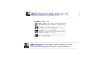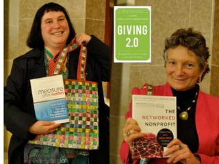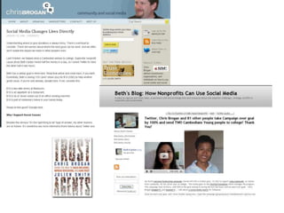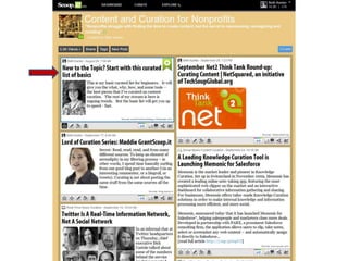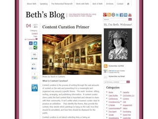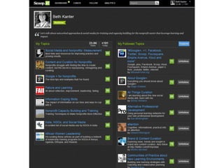 Beth Kanter shared her story of success with social media and principles of content strategy. She emphasized setting measurable objectives, identifying influencers, and using ongoing relationship building. Kanter also stressed the importance of integrated content creation, coordination, and curation strategies. This includes organizing topics, remixing content, and curating the best external content to share. Finally, she discussed measuring social media using appropriate metrics to improve results over time.
