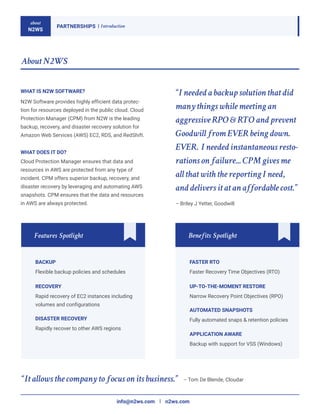 N2WS offers a comprehensive data protection solution, Cloud Protection Manager (CPM), for AWS resources, ensuring efficient backup, recovery, and disaster recovery. The software automates snapshots and provides flexible backup policies, helping service providers enhance customer protection while generating recurring revenue. With features like centralized dashboards and self-service options, N2WS supports partners in delivering effective cloud solutions and improving customer satisfaction.