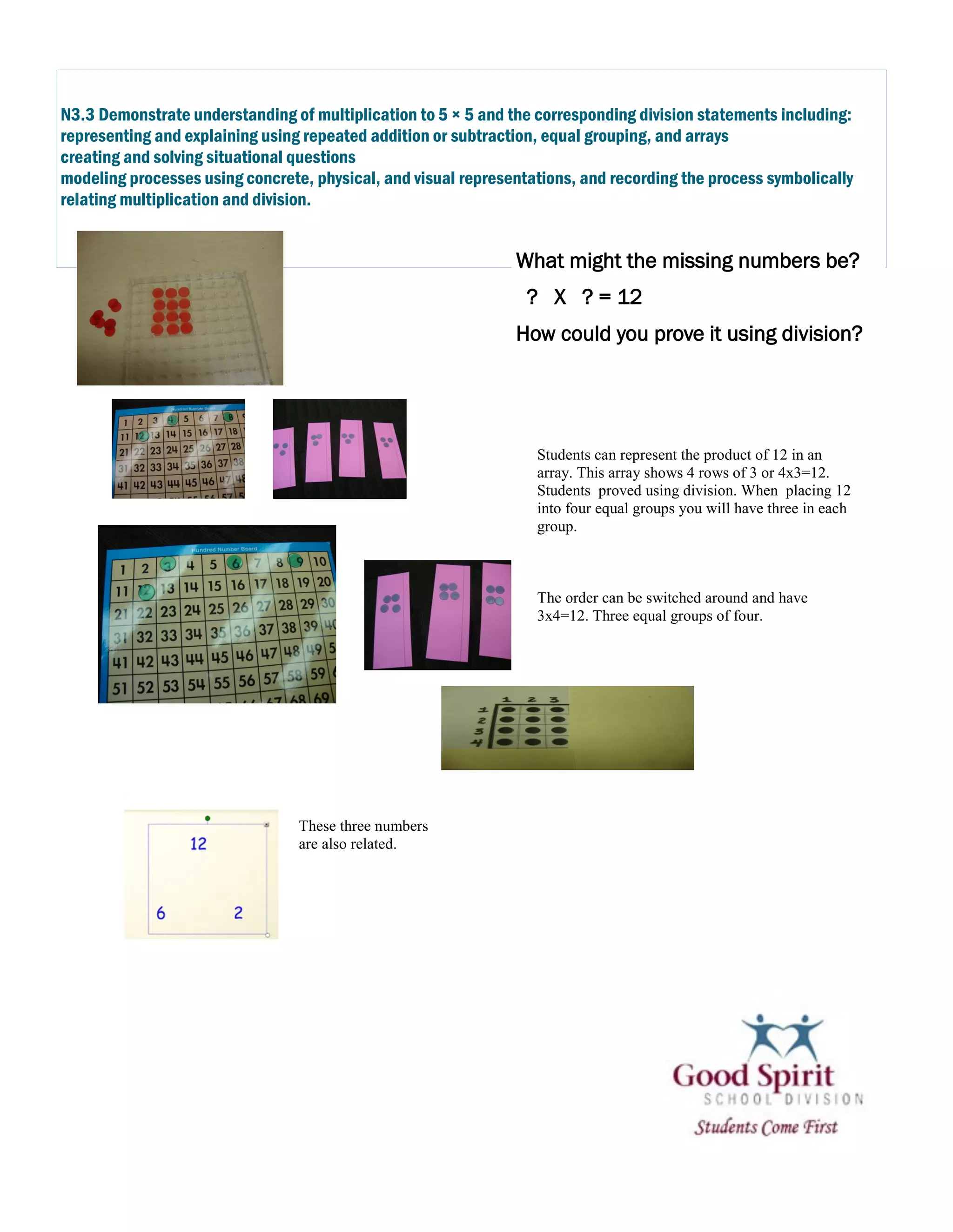 Students will demonstrate understanding of multiplication up to 5 × 5 and the corresponding division. This includes representing and explaining multiplication using repeated addition, equal groups, and arrays. Students will create and solve word problems using multiplication and division. They will model these processes using concrete, visual, and symbolic representations and understand the relationship between multiplication and division.