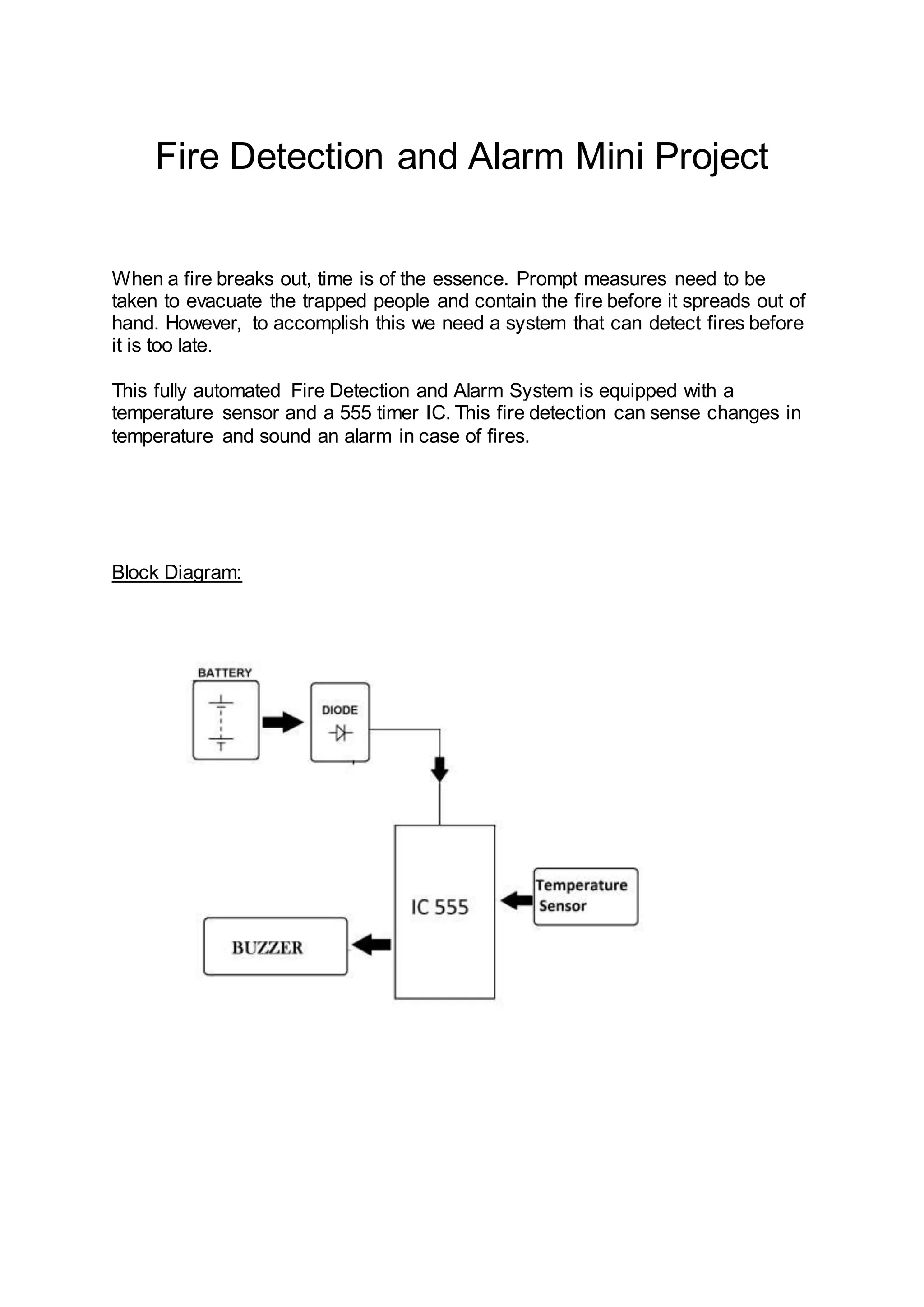 This document describes a fire detection and alarm mini project that uses a temperature sensor and a 555 timer IC to detect changes in temperature and sound an alarm in the event of a fire. The system aims to promptly detect fires so that trapped people can be evacuated and the fire contained before it spreads out of control. It provides a block diagram and lists the various hardware components needed, including a temperature sensor, resistors, capacitors, transistors, cables, connectors, diodes, a PCB, breadboards, an LED, a transformer or adapter, push buttons, a switch, and an IC.