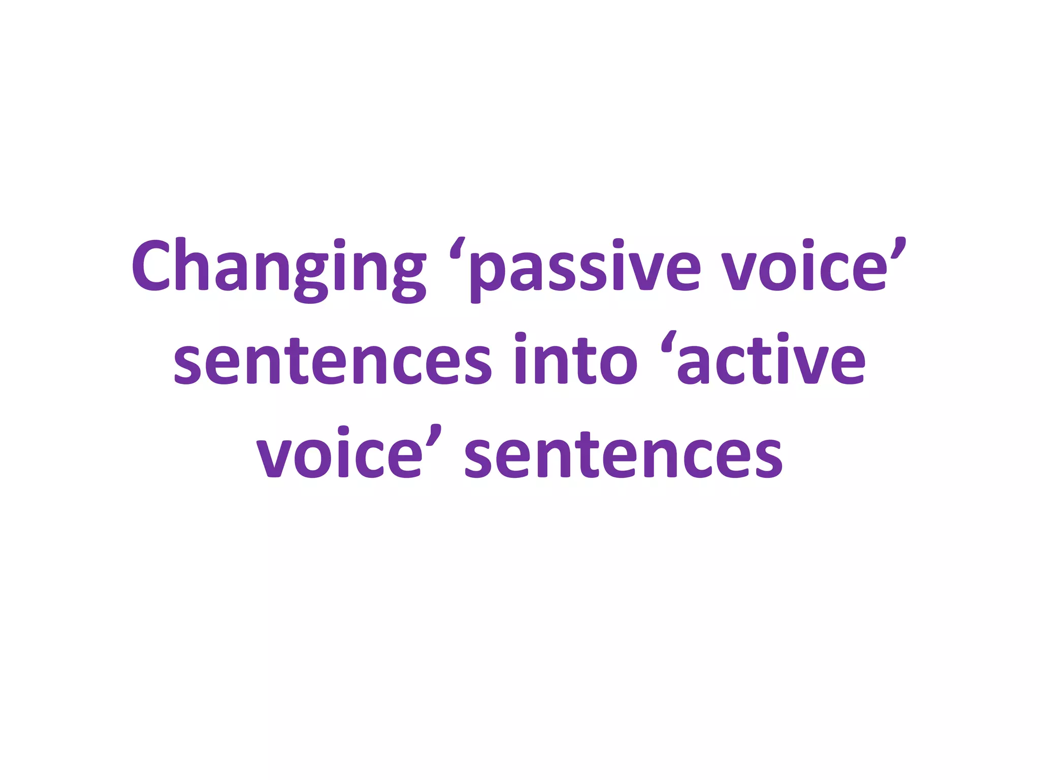 The document explains the difference between passive and active voice in writing, highlighting that passive voice emphasizes the object while active voice emphasizes the doer of the action. It provides a guide on how to convert passive voice sentences into active ones by removing the helping verb and changing the structure to include a subject. Additionally, it outlines the rules for determining verb tense when converting between voices.