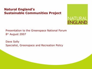 Natural England's Sustainable Communities Project aims to enhance the natural environment through collaboration with local communities, developers, and government bodies. With a two-year timeframe, the project focuses on green infrastructure in designated growth areas, promoting better access to greenspaces while addressing various recreational policy drivers such as health and well-being. Key goals include establishing strategic arrangements and delivering exemplary greenspace sites to improve environmental quality and biodiversity.