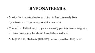 This document discusses electrolyte imbalances focusing on sodium and potassium. It covers the causes, signs, symptoms, investigations, and management of hyponatremia, hypernatremia, hypokalemia, and hyperkalemia. Specifically, it classifies the severity of the imbalances and describes the pathophysiology involving fluid shifts between extracellular and intracellular compartments. It provides detailed guidelines for evaluating patients and correcting electrolyte abnormalities through fluid management and medication.