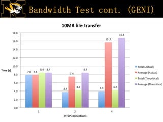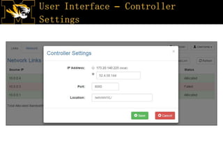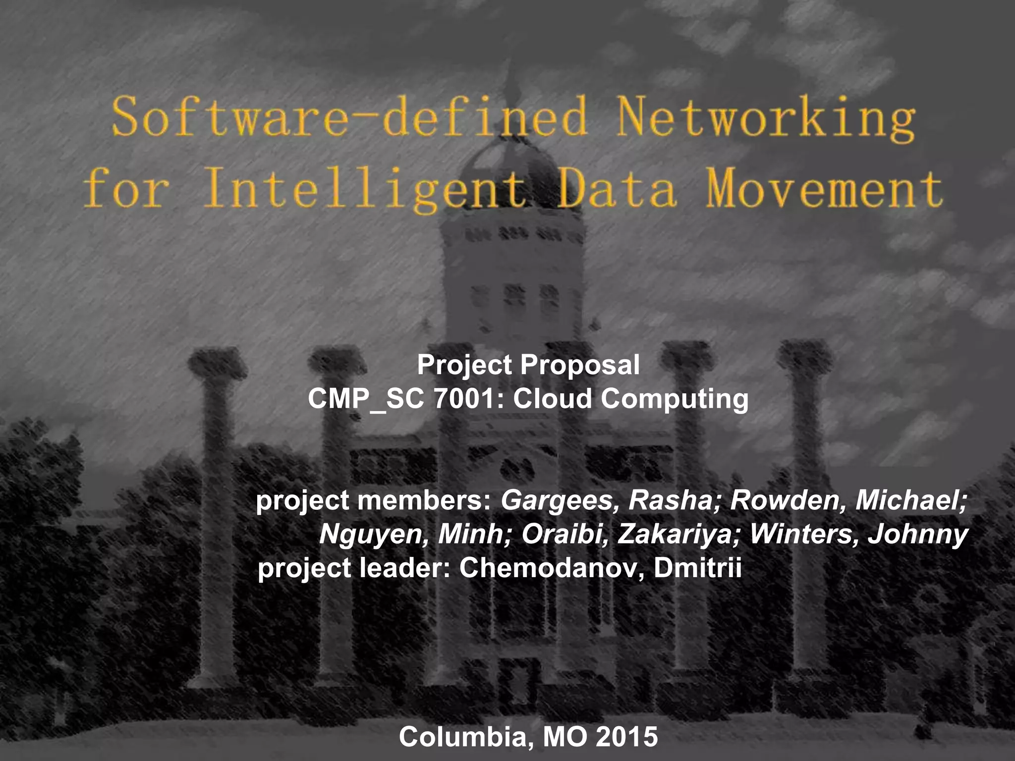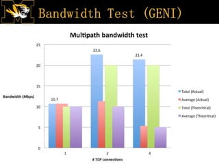 This project proposal summarizes a cloud computing project that uses software-defined networking (SDN) to enable intelligent data transfer and distributed computing applications. The project uses TCP multipath routing to split traffic across multiple network paths and an SDN controller to manage virtual network links for users. A demo interface allows users to view and request virtual links via a REST API.