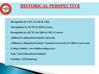 This document provides information about K.L.B. D.A.V College for Girls in Palampur, India. It is a self-financing college established in 1969 that provides undergraduate and postgraduate courses. It has recognition from various regulatory bodies. The college follows curriculums set by Himachal Pradesh University and provides student support services including placements, library resources, and extracurricular activities. It aims to provide quality education to empower women and has various facilities like labs, library, and hostel. The college is managed by a governing body and has 11 faculty members.