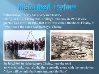 Naberezhnye Chelny has a rich history dating back to 1172 when it was first a village called Chelny. It was granted town status in 1930 and renamed several times before taking its current name in 1988. Today it is one of the largest towns in Tatarstan, known for being home to the massive Kamaz vehicle factory, which has made it a major industrial center. The population is nearly 600,000 people.