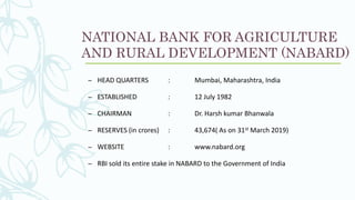 NABARD is the National Bank for Agriculture and Rural Development established in 1982 by the Government of India to aid rural development. Headquartered in Mumbai, NABARD provides credit and banking services to promote rural development, support agriculture and allied activities. It serves as a refinancing body and promotes policies and programs focused on integrated rural development and financing agriculture.