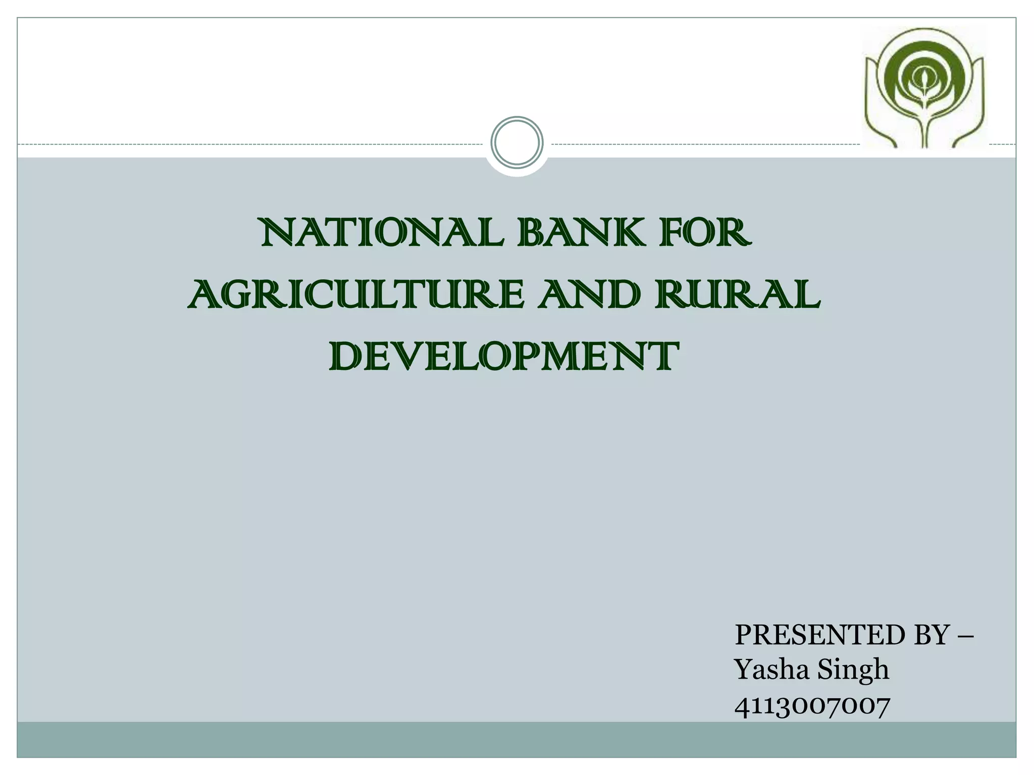 The National Bank for Agriculture and Rural Development (NABARD) was established in 1982 on the recommendation of a committee to promote sustainable and equitable development of rural areas by facilitating credit and other support. NABARD provides refinancing to banks and cooperatives, acts as a coordinator between institutions, and undertakes research and training. Its roles include rural credit planning, promoting financial inclusion, and assisting state governments' rural development targets.
