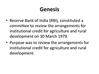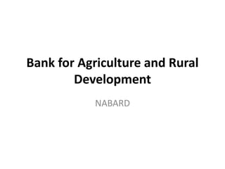The document summarizes the origins and functions of the National Bank for Agriculture and Rural Development (NABARD) in India. It was established in 1982 to provide credit and other support services to promote rural and agricultural development. Key points include that NABARD provides refinancing to rural banks, coordinates rural development programs, and promotes initiatives like microfinance and support for farmers through training centers.