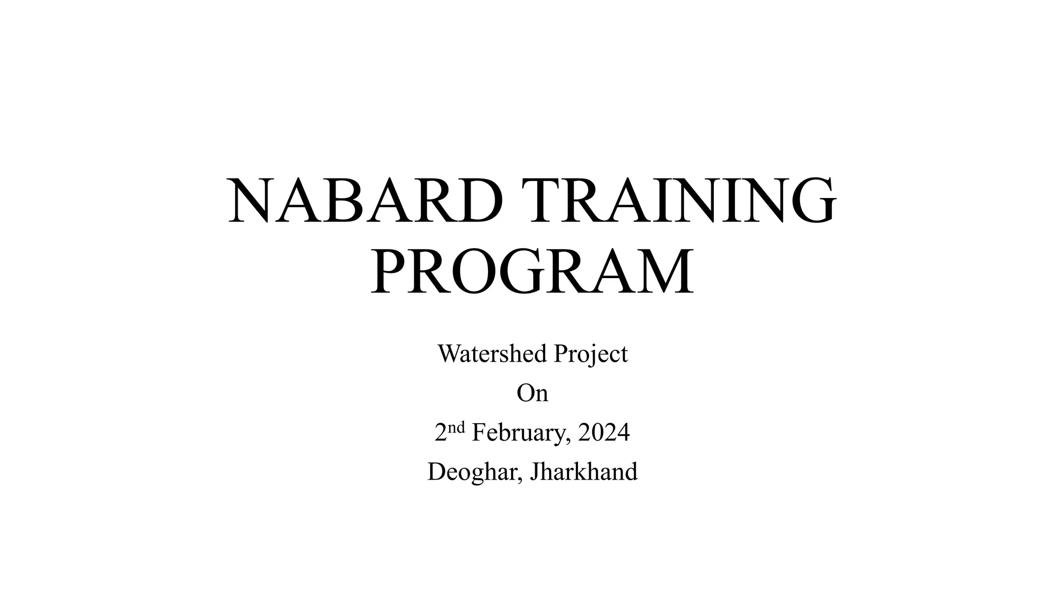 The document provides information about a NABARD training program on watershed projects. It begins with basic definitions related to watersheds and hydrology. It then discusses watershed management approaches, including area treatment, drainage treatment, capacity building, and implementation. Specific drainage line treatment measures are described such as gully plugs, check dams, sod flumes, and loose boulder check dams. Design principles, benefits and limitations of these structures are covered. Examples of designing loose boulder check dams are provided with details on spillway sizing and structure spacing.
