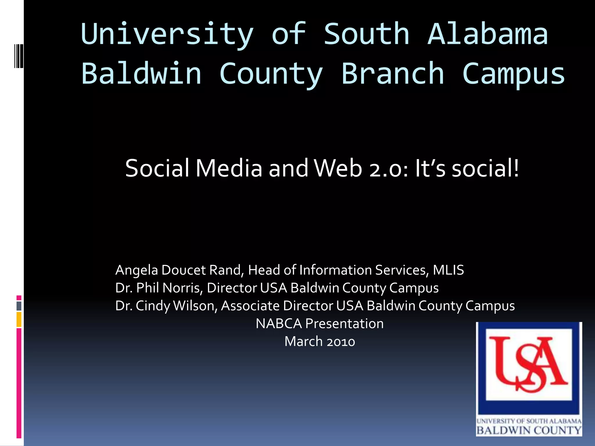 The document discusses using social media and web 2.0 technologies at university branch campuses. It recommends establishing communication venues like social networks, considering available resources, identifying obstacles, and measuring engagement. Sharing experiences and planning ahead are also advised. While change can be difficult, creativity and innovation are needed to shift paradigms and take advantage of new opportunities presented by technologies like social media.