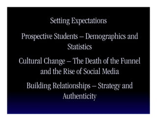 This document discusses building relationships through authentic recruitment in the age of social media. It notes the cultural change from traditional marketing funnels to social media and the importance of strategy and authenticity. Various recruitment factors are also listed such as demographics, scholarships, campus size, class size, academic programs, athletics, financial aid, housing and extracurricular activities that can be used to build relationships with prospective students.