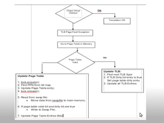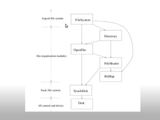 The document discusses the differences between user programs and the kernel. It explains that the kernel runs in supervisor mode and manages system resources, loading and allocating memory for user programs. It also covers virtual memory systems, how they use page tables to map virtual to physical addresses, and how the page fault handler works to load pages from disk when needed. Finally, it discusses file systems and techniques used like block buffer caches to reduce disk access and improve performance.