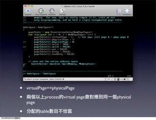 This document discusses implementing multiprogramming by using virtual memory pages that map to physical memory pages through a page table. A process's virtual address space is mapped to physical pages using an address space class and page table to translate virtual addresses to physical addresses when reading from memory.