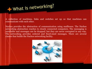 The document discusses the networking abstraction in NachOS which uses mailboxes for communication between closely connected machines, with messages that are unreliable but not corrupted, and provides ordered and fixed-sized messages. It explains the handshake process between a host and gateway server using sequence numbers to establish and acknowledge connections. Sources are provided for further information on TCP sequence and acknowledgement numbers, networking topics, and an open courseware blog.