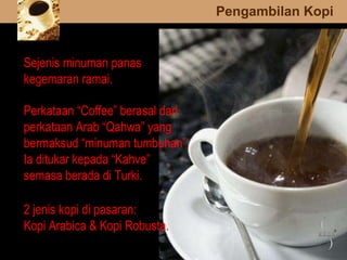 Dokumen ini menjelaskan kopi, khususnya kopi arabica dan robusta, yang merupakan minuman popular dengan berbagai manfaat kesihatan. Ia menerangkan penggunaan tongkat ali dan maca sebagai bahan tambahan untuk meningkatkan tenaga, kesuburan, dan mengatasi keletihan. Nacofé, sebagai produk kopi istimewa, menggabungkan kedua-dua bahan ini untuk memberikan rasa dan aroma yang unik.