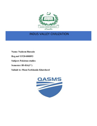 The document contains the answers to 16 questions about the Indus Valley Civilization submitted by a student named Nadeem Hussain for their Pakistan Studies course. Some of the key details provided in the answers include: the Indus Valley Civilization co-existed with other ancient civilizations in Mesopotamia and Egypt; its population may have exceeded 5 million people; it declined around 1800 BCE possibly due to climate change and the migration of Indo-European groups. The civilization had advanced urban planning, water and drainage systems, and engaged in long-distance trade.