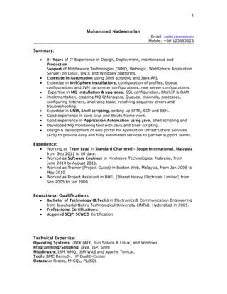 This document provides a summary of Mohammed Nadeemullah's professional experience and qualifications. He has over 8 years of experience in IT with expertise in middleware technologies like WebSphere, WebLogic, and IBM MQ. He has worked as a team lead and technical specialist on projects for Standard Chartered Bank and Mindwave Technologies. His skills include Java, shell scripting, UNIX, and middleware administration. He holds a Bachelor's degree in Electronics and Communication Engineering.