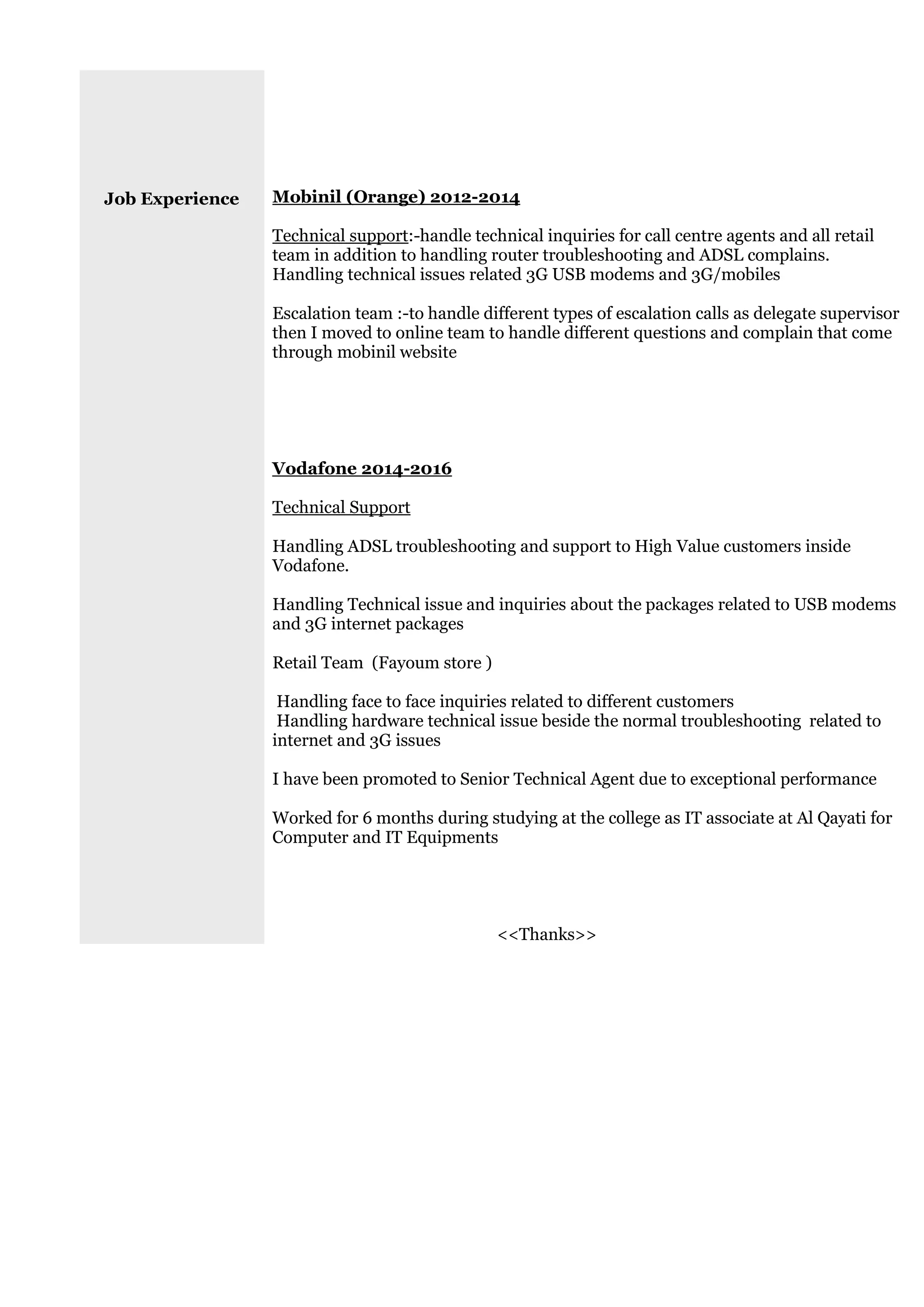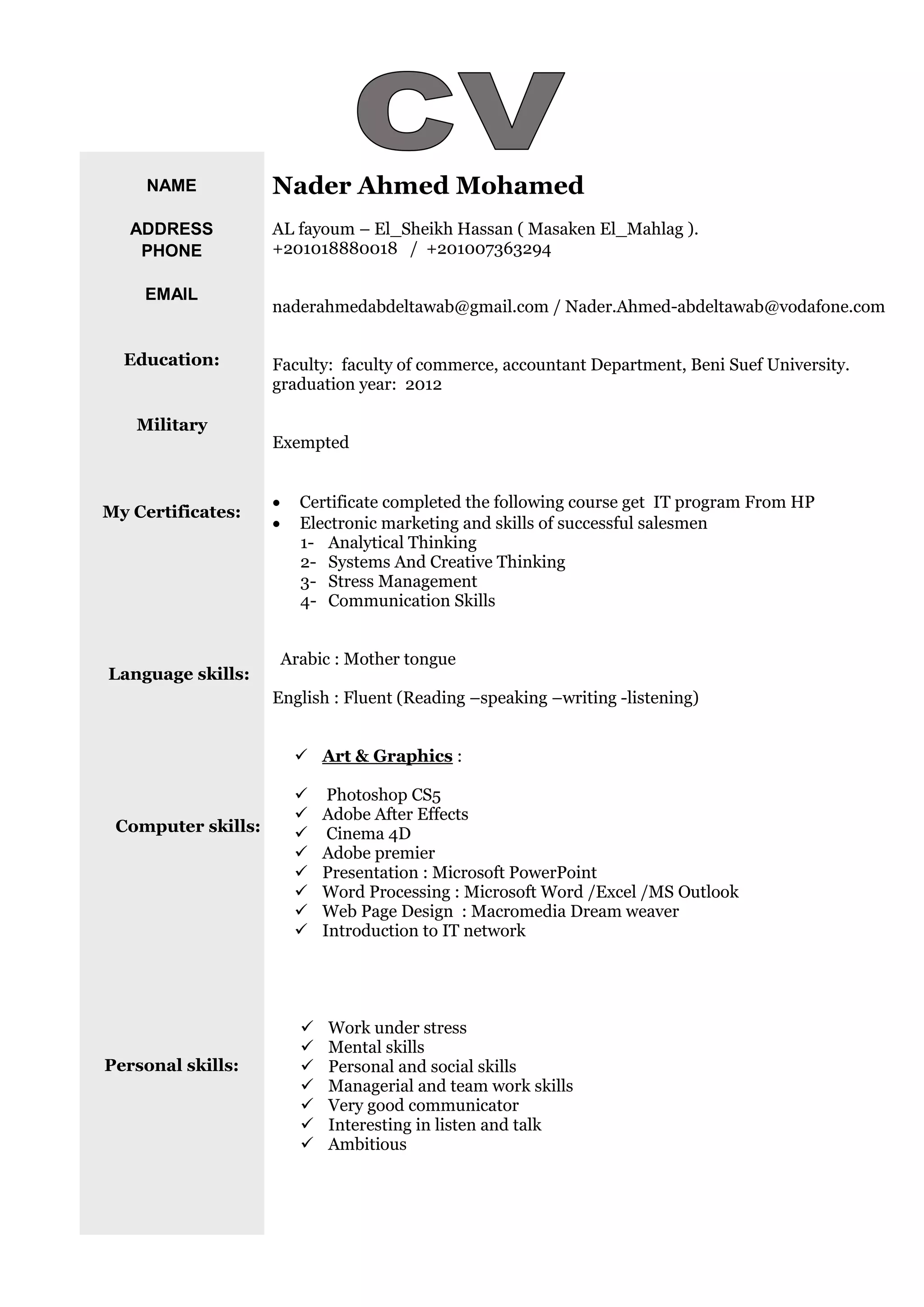 This document provides a summary of Nader Ahmed Mohamed's personal and professional details. It includes his name, address, contact information, education background graduating from Beni Suef University in 2012. It lists his certificates in IT programs from HP and electronic marketing. It also outlines his language skills in Arabic and English and computer skills including Photoshop, After Effects, and Microsoft Office. Finally, it details his work experience from 2012-2016 at Mobinil and Vodafone in technical support roles handling inquiries and issues for customers.