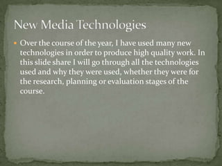 The document discusses the various technologies used over the course of a year-long project. These included cameras, computers, editing software, and online platforms. The HDV camera, tripod, iMac, Photoshop, Final Cut Express, PowerPoint, and YouTube were used at different stages for filming, editing, planning, and evaluating the project, which involved producing a music video. Other technologies like the iPhone, digital camera, and Blackberry Playbook also supported the project in areas like taking photos and playing music.